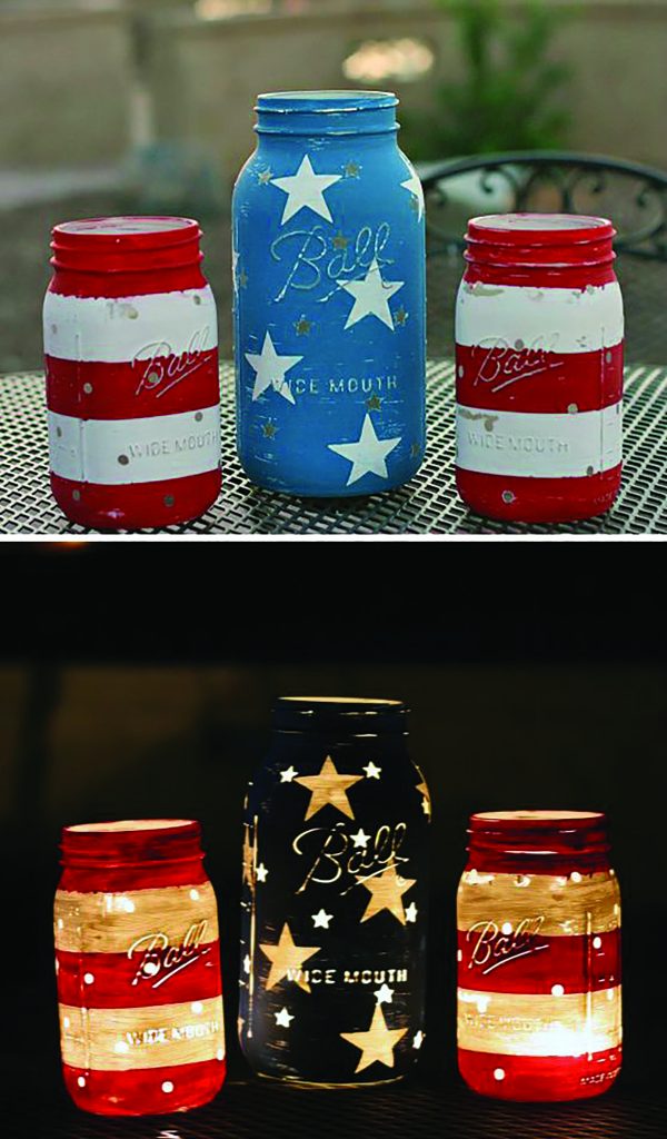 Use existing mason jars or find them at your grocery store and turn them into an illuminated American flag. Tape off, paint red and white stripes and use star stickers to create this look. Just finish off with candles or battery operated string lights.