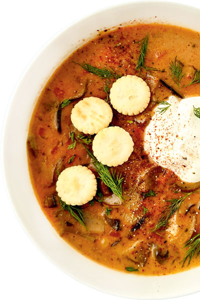 Serve the soup hot, garnished with fresh dill, sour cream, and a hunk of crusty bread.